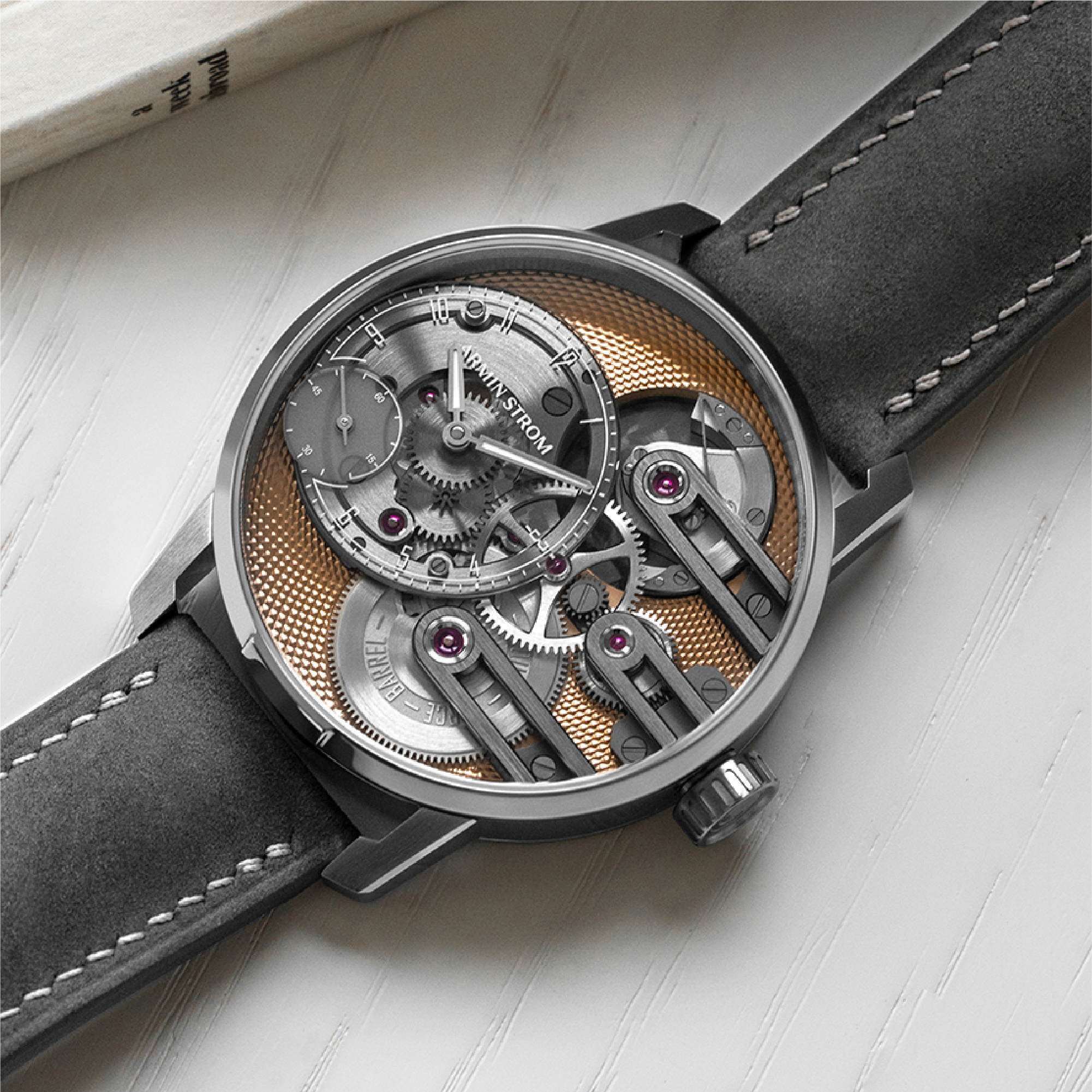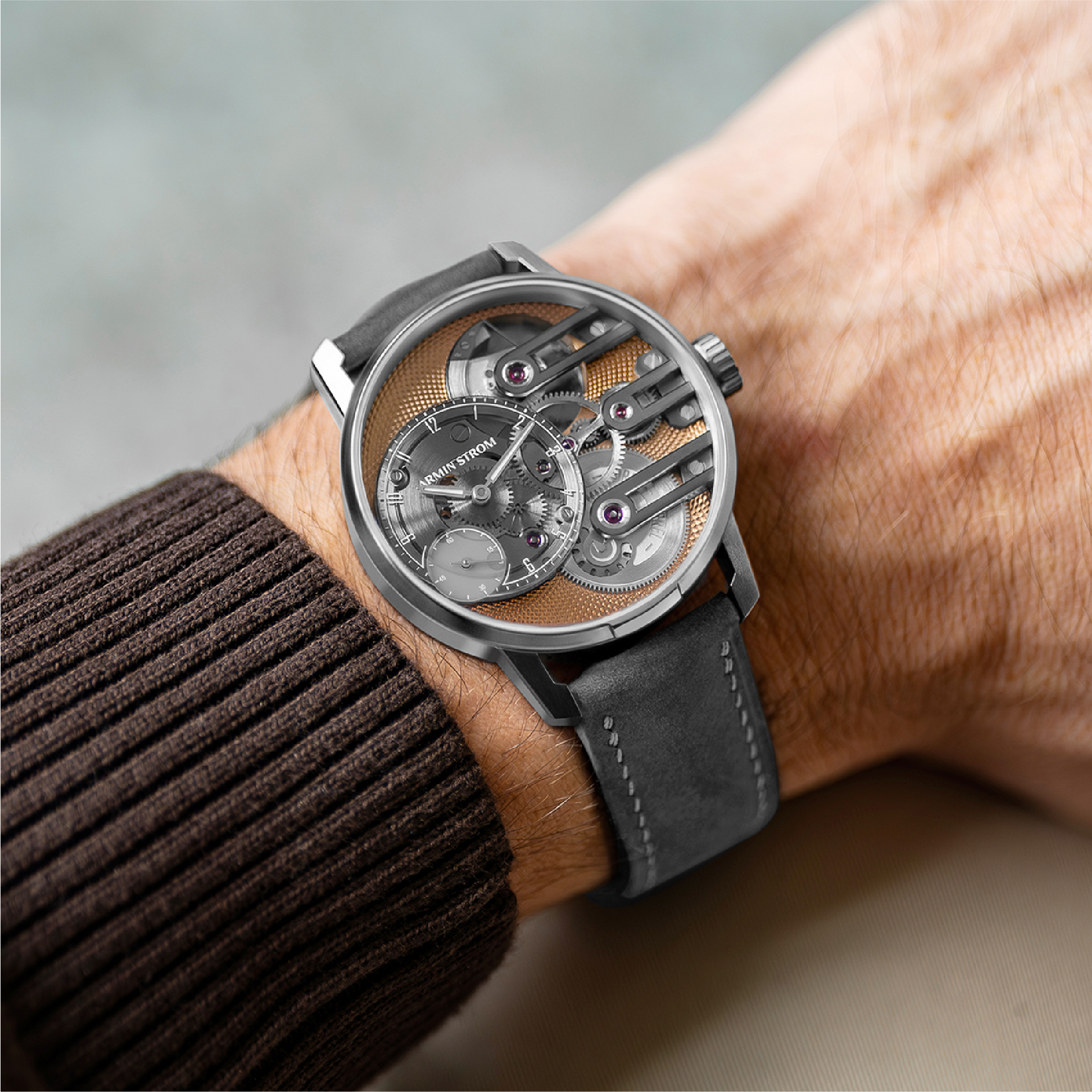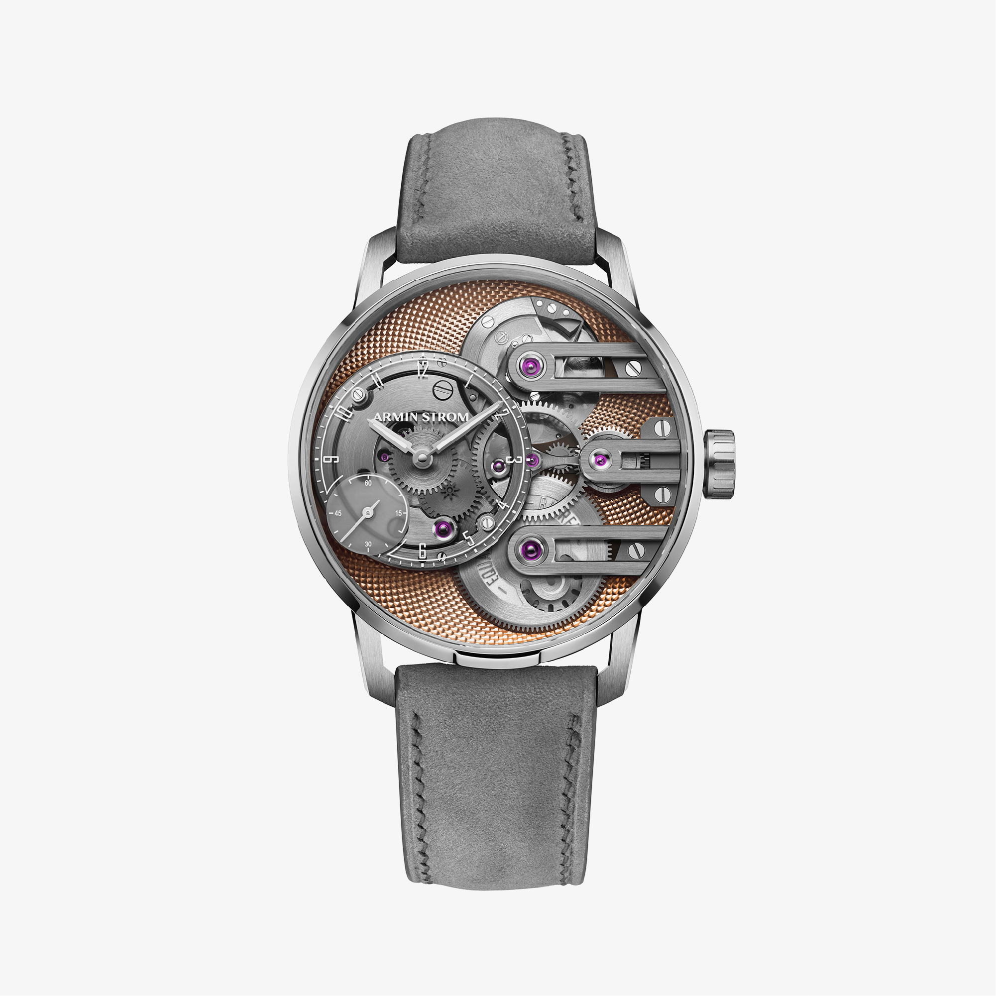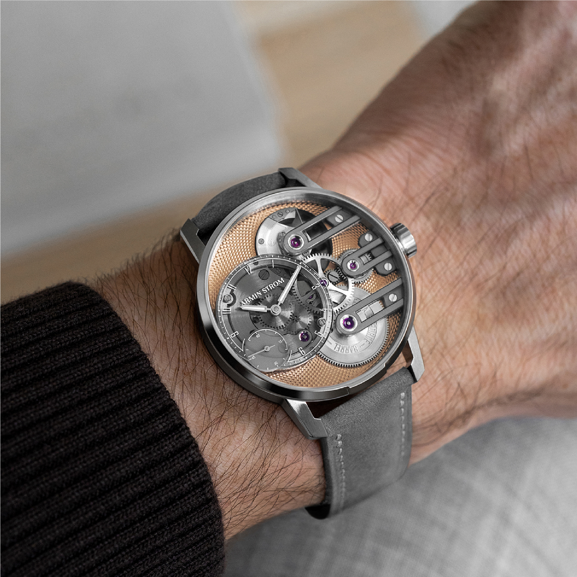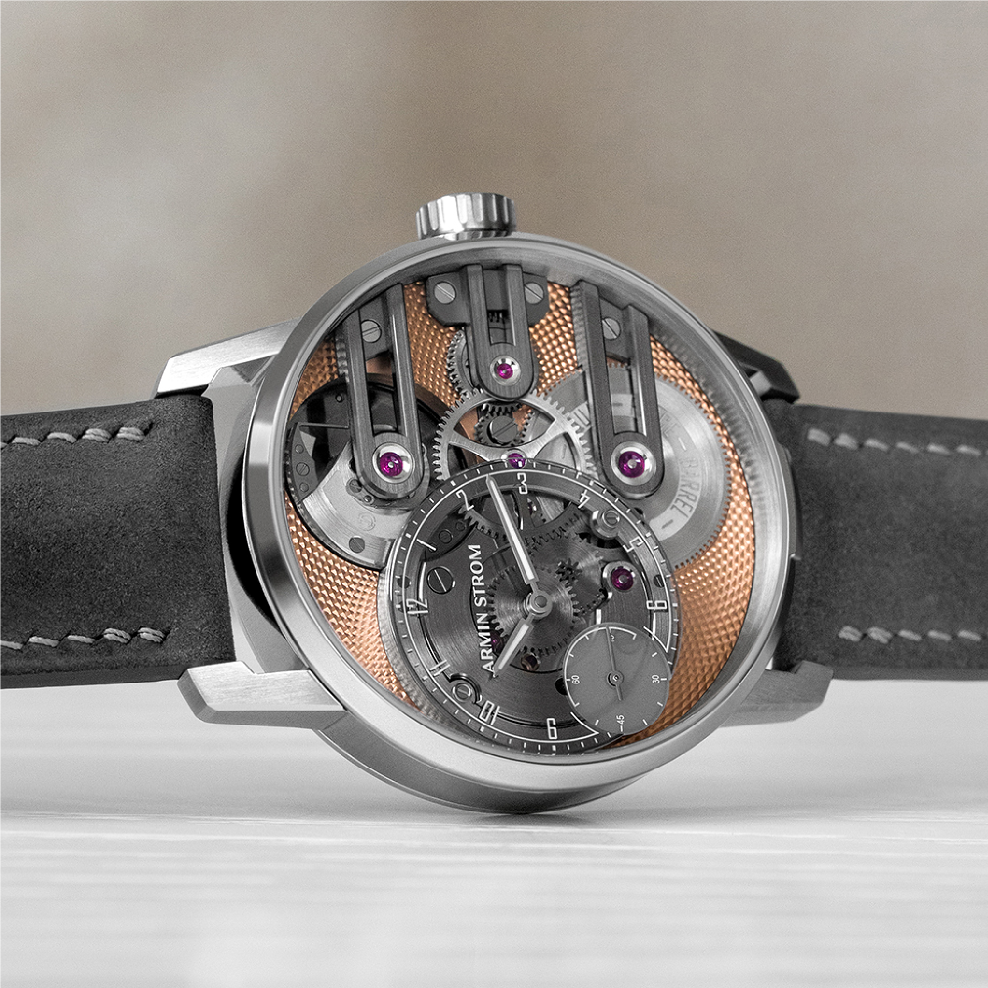A refined evolution of Armin Strom’s Gravity Equal Force, featuring a salmon PVD mainplate, sapphire dial, and the brand’s patented equal-force micro-rotor movement. Limited to 25 pieces per year.