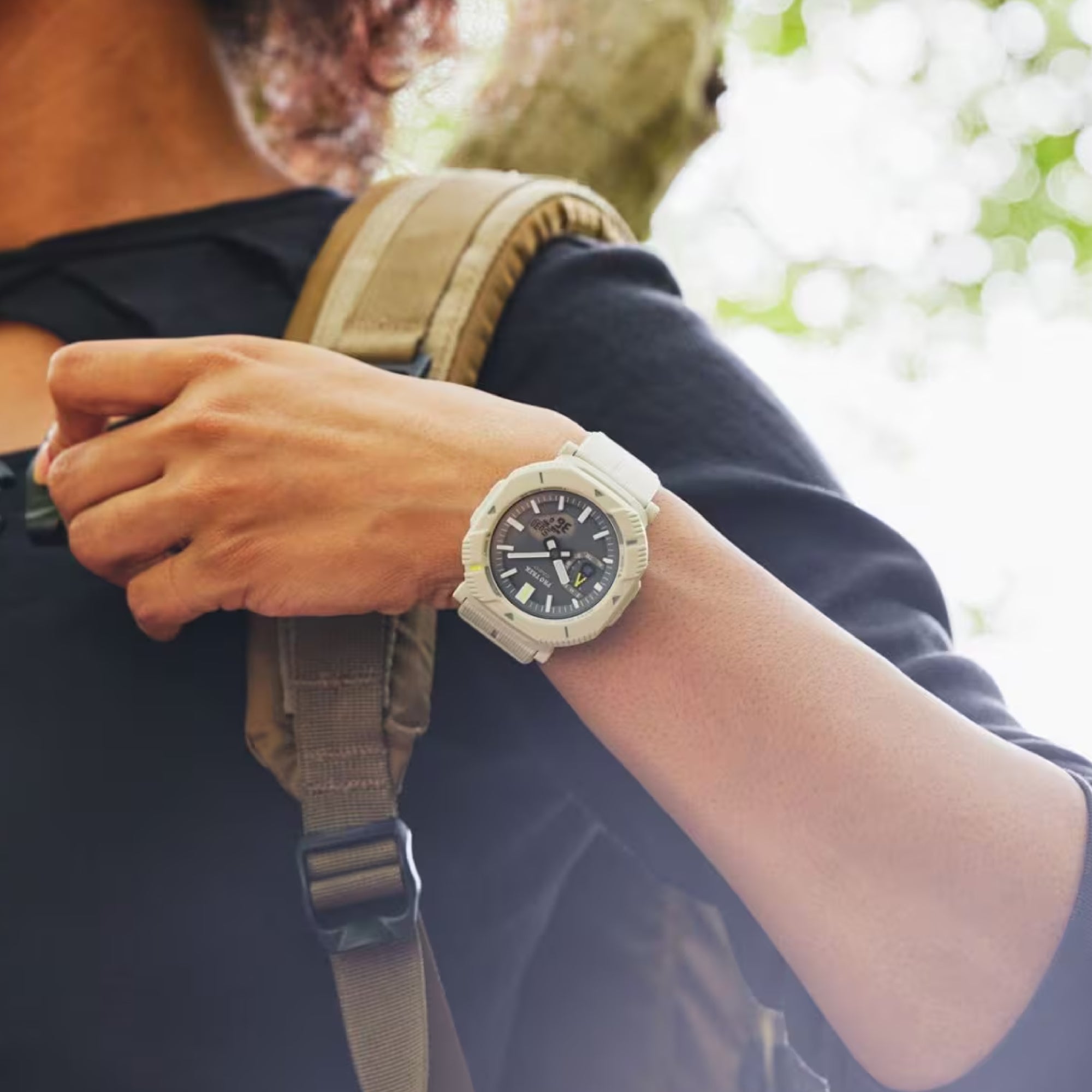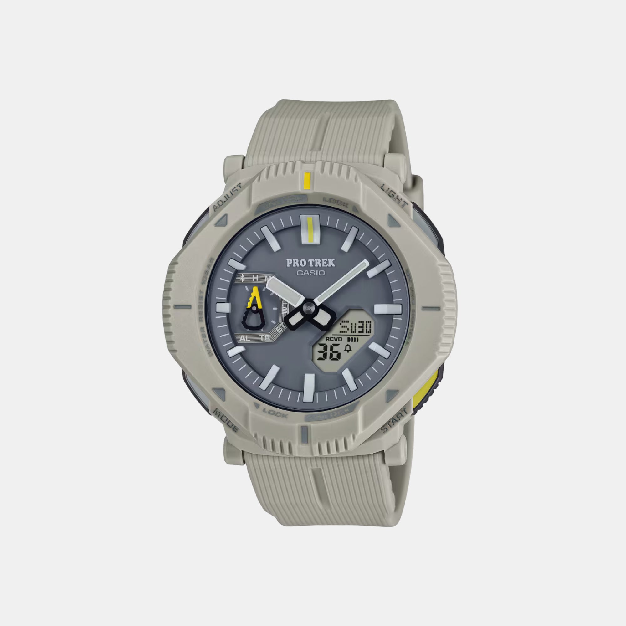 Designed for the adventurer, the PRJ‑B001‑7DR features a rugged yet comfortable resin case and band with advanced outdoor functions. Solar power, Bluetooth link, and world time make it ideal for hiking, travel, and everyday wear, while its light weight (~44 g) ensures all‑day comfort.