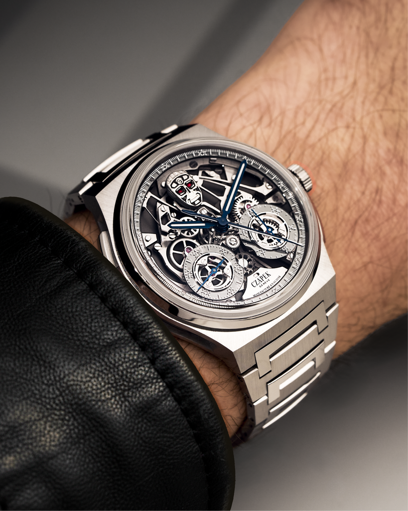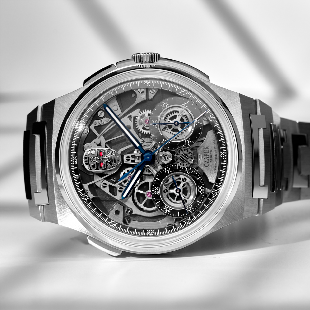 The Antarctique Rattrapante R.U.R. is Czapek & Cie’s boldest take yet on its signature split-seconds chronograph. Beneath a grey-metallised sapphire dial, a titanium robot head — hand-polished, laser-engraved, and micro-painted — animates with every press of the chronograph pushers. Start, its eyes flash yellow. Stop, they burn red. Reset, they glow blue. A playful animation, hardwired into haute horlogerie.