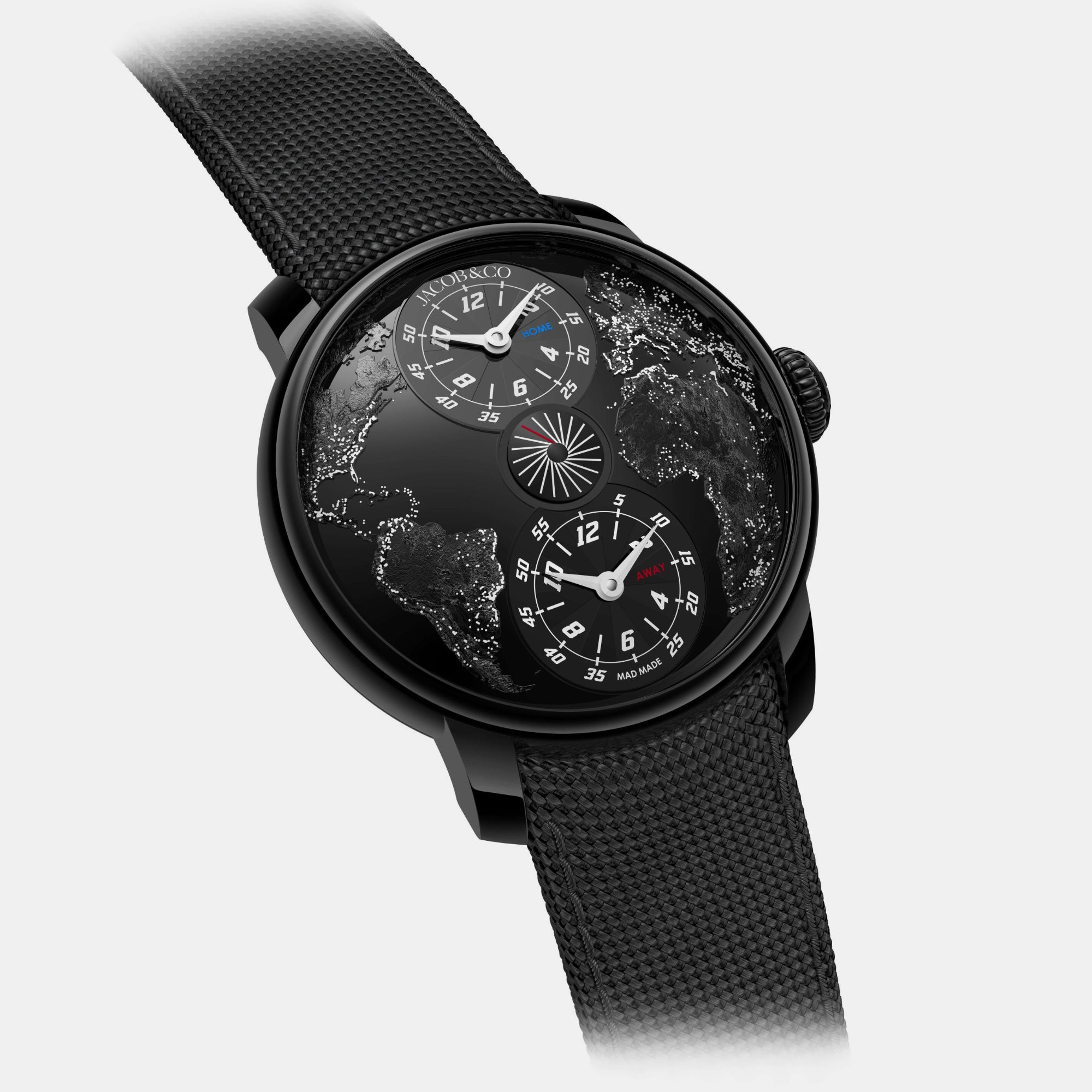 This black DLC steel version of The World Is Yours Dual Time Zone is the first model to be crafted in partnership with MAD Paris. If The World Is Yours Dual Time Zone represents the world from above by daytime, this is its night time counterpart. Not only is it dark, with a black case, black dial and black continent, but it glows in the dark.