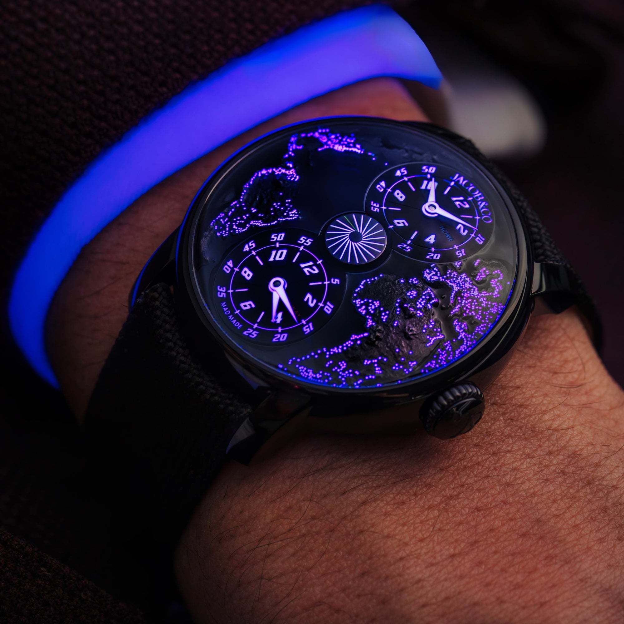 When the lights are off, the luminescence of The World Is Yours Dual Time Zone MAD Paris appears. The world map is filled with hundreds of Individually applied city lights. The sub-dials feature a MAD Paris typeface, and the center small seconds look like a wheel, giving The World Is Yours Dual Time Zone MAD Paris its absolutely modern look.