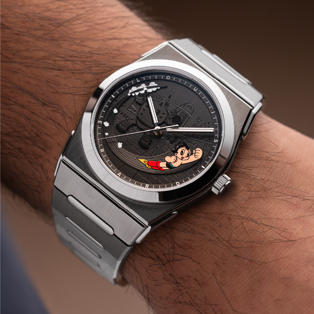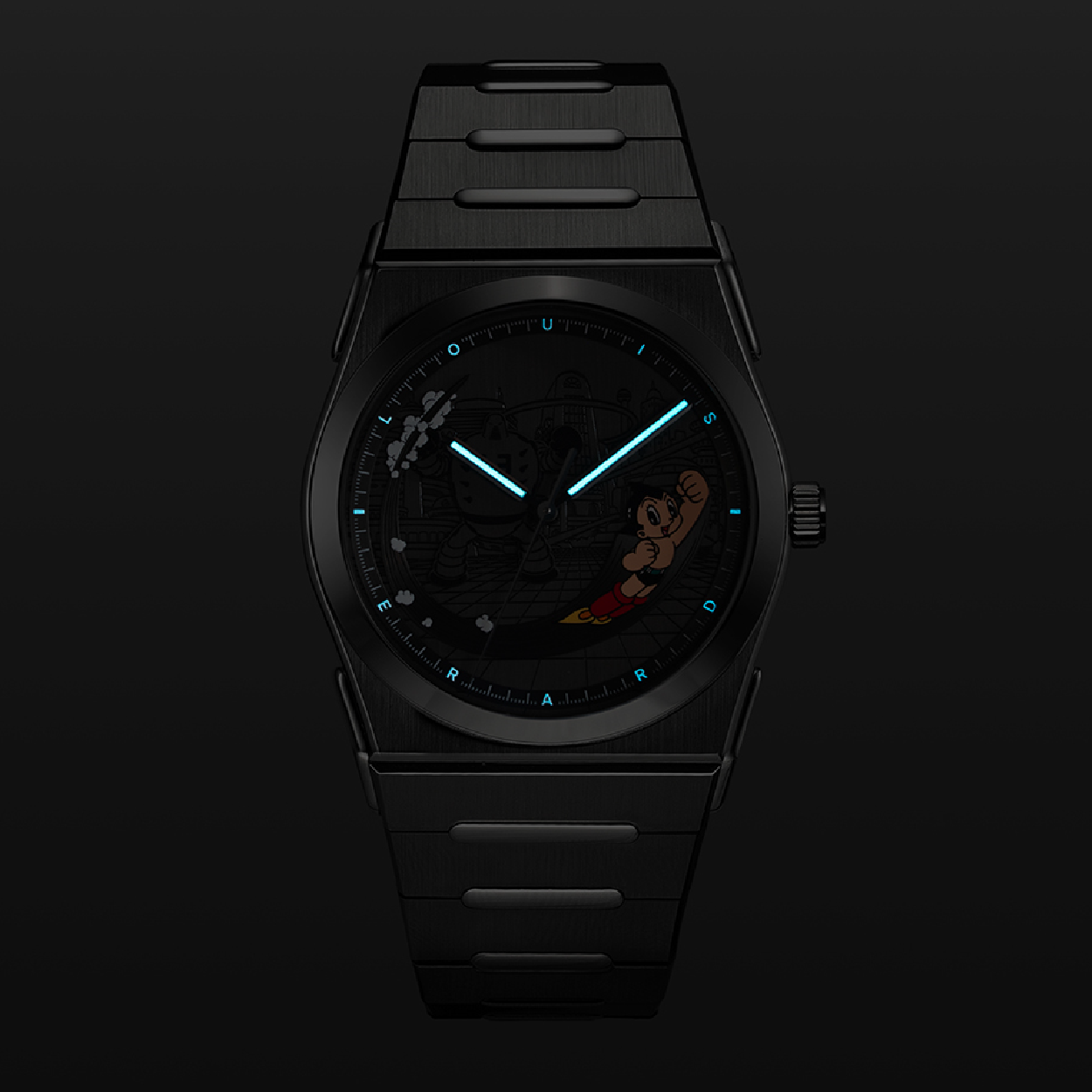 Astro Boy is applied, not printed, layered on the dial with dynamic depth and motion. Behind him: a subtle engraving of Metro City and one of his iconic foes, rendered in black. Every element builds a cinematic scene of motion, light, and emotion — illuminated at night by Super-LumiNova SLN-C1.
