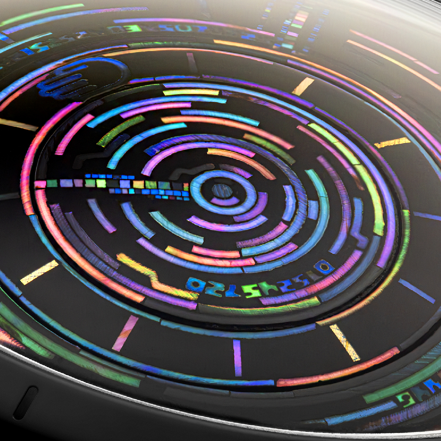 The DLC-coated titanium architecture frames a dial built using traditional Japanese urushi lacquer and raden mother-of-pearl inlay. Each element is meticulously shaped and layered by hand, following the curvature of the rotating convex display. Inspired by planetary motion and heliocentrism, the composition evolves continuously as the ROCS display rotates, creating the impression of a coded message drifting through space.