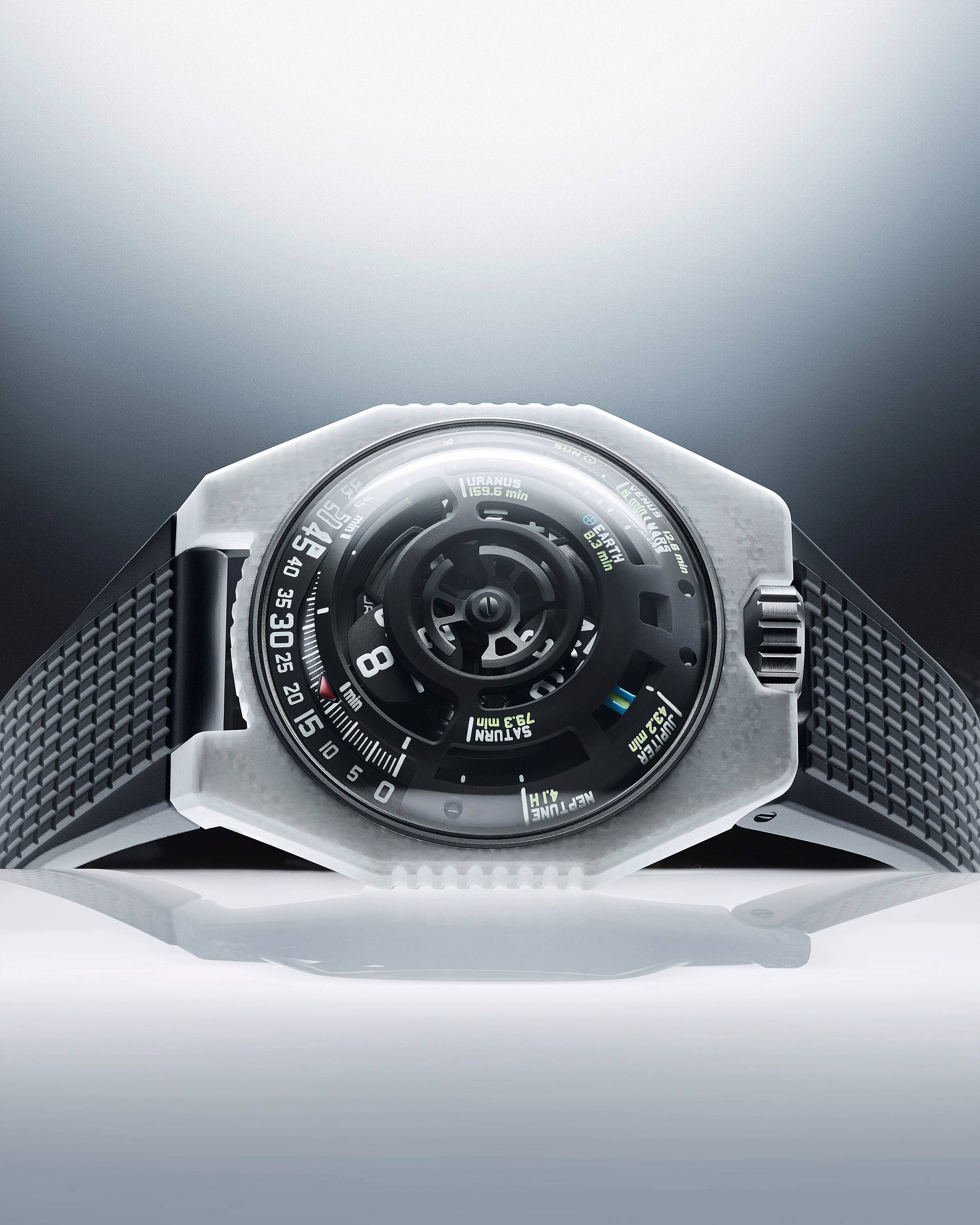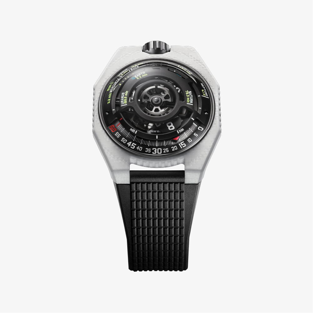 The UR-100V LS Ceramic “LightSpeed” rethinks timekeeping by translating the speed of light into a mechanical experience. Using URWERK’s signature wandering hour satellite, the watch shifts roles mid-cycle—moving from minutes to mapping the journey of a photon travelling from the Sun to the planets.