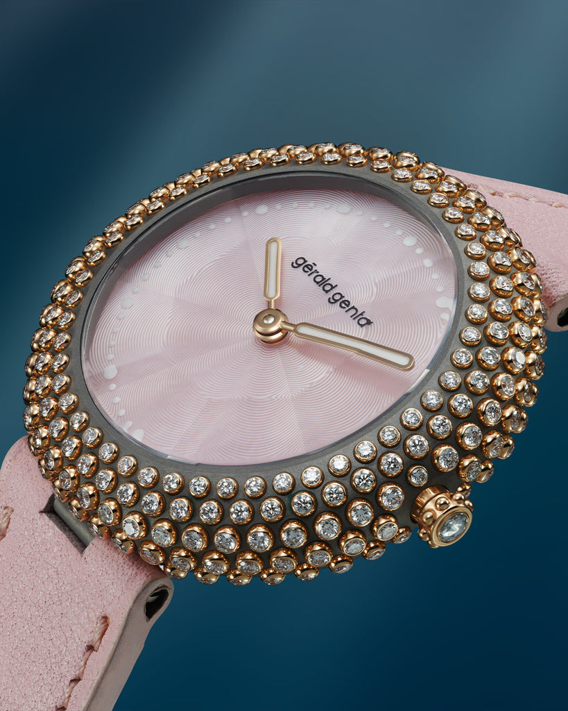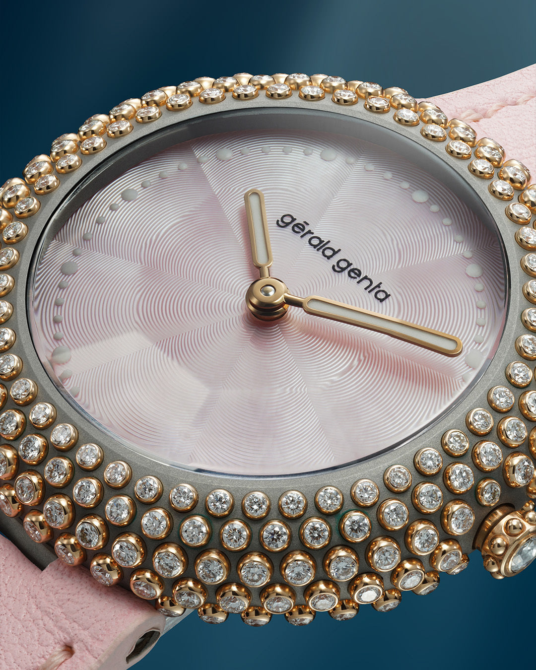 Softness meets spectacle in the Gentissima Oursin 36 Pink Mother of Pearl — a luminous composition of titanium, rose gold, and diamonds that transforms light into texture.