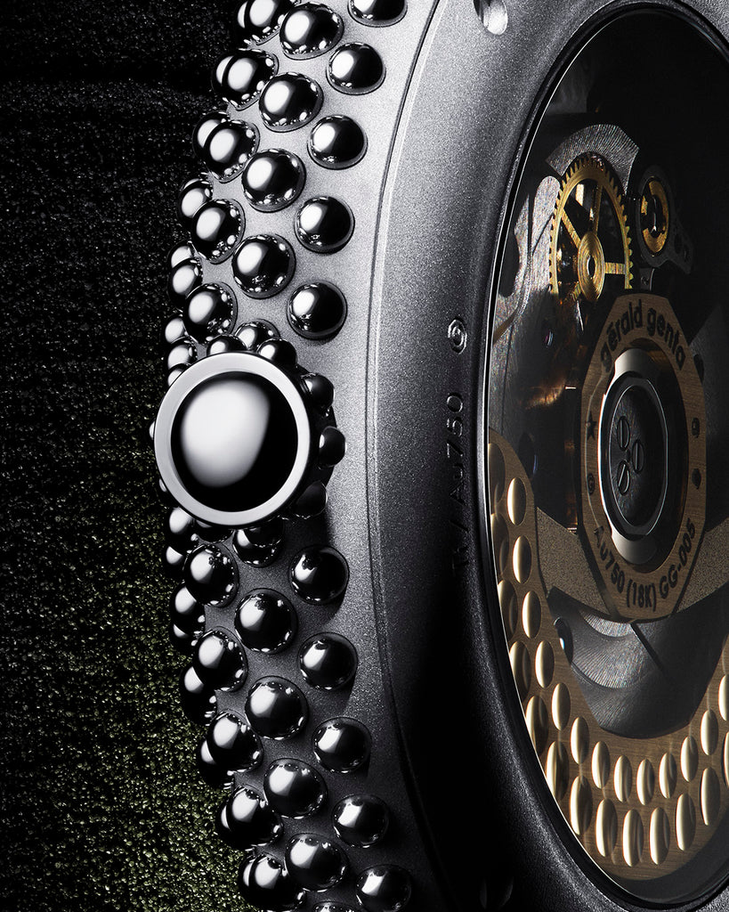 Born from one of Earth’s rarest materials, the green meteorite dial shifts between deep forest tones and iridescent mineral flashes depending on the light. Framed inside a sandblasted Grade 5 titanium case set with 234 white-gold beads, the piece feels sculptural, contemporary, and unmistakably Genta.