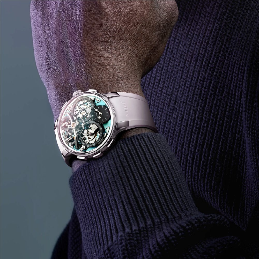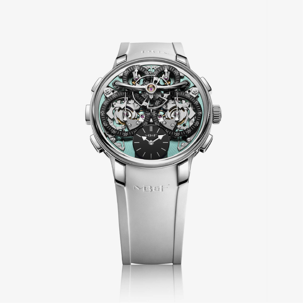 The Legacy Machine Sequential Flyback EVO pushes MB&F’s radical chronograph concept even further. Housed in a Grade 5 titanium EVO case and paired with an aquamarine dial plate, this latest evolution introduces flyback functionality to both chronographs, alongside a newly inclined time display for improved legibility.