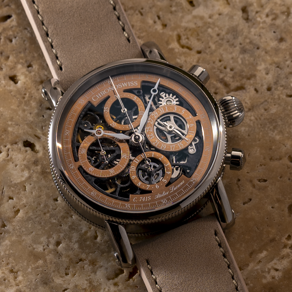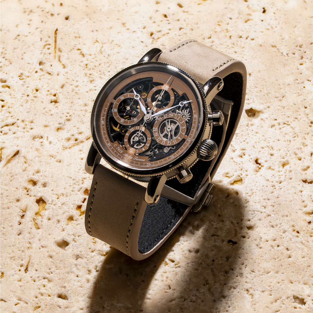 To mark 30 years of the Opus, Chronoswiss heads where few chronographs dare: the desert. The Opus Dakar is a study in warmth and restraint — titanium, sand, and skeleton mechanics distilled into one quietly commanding piece. It honours the original 1995 Opus DNA while evolving it through new materials, earth-born tones, and a tactile sense of calm precision.
