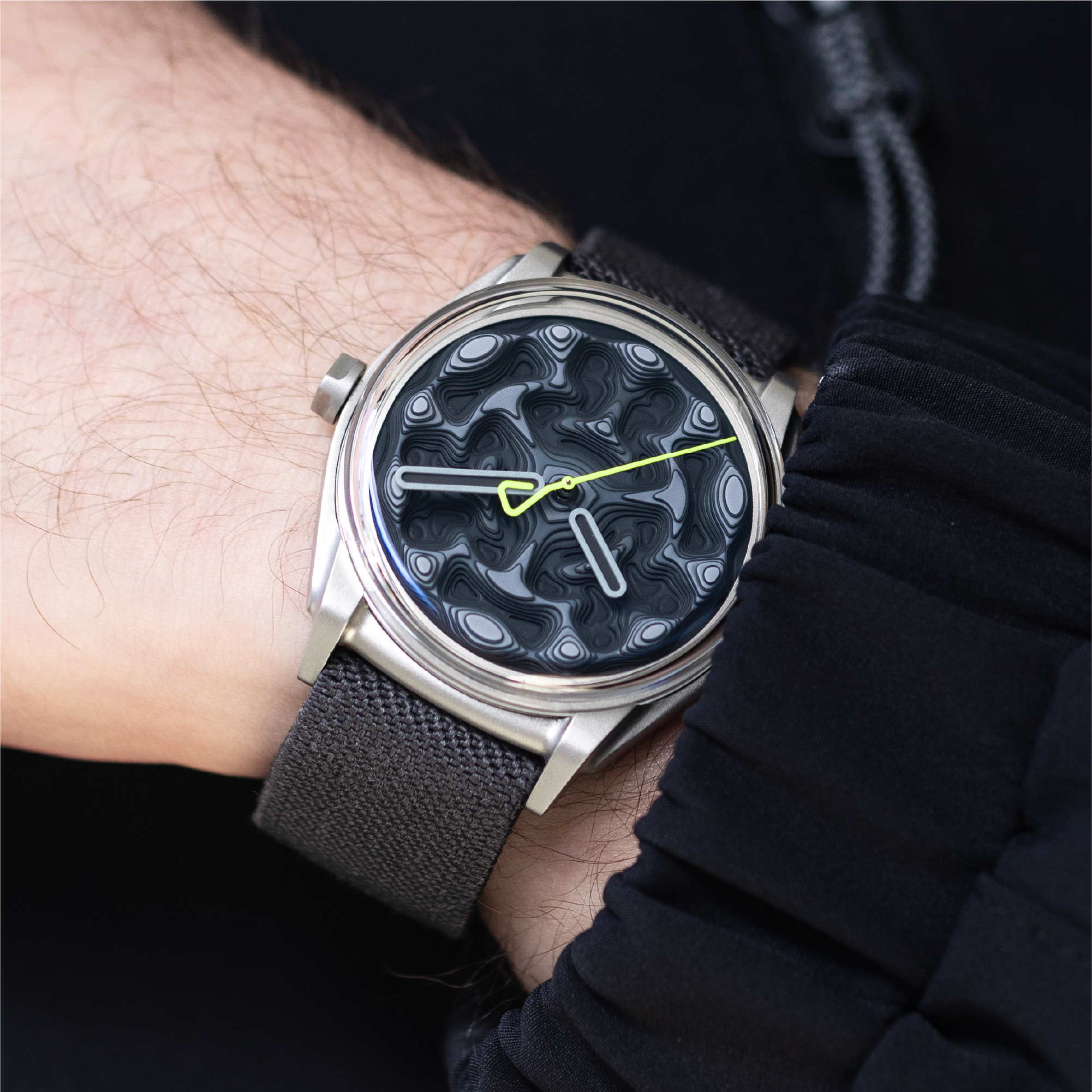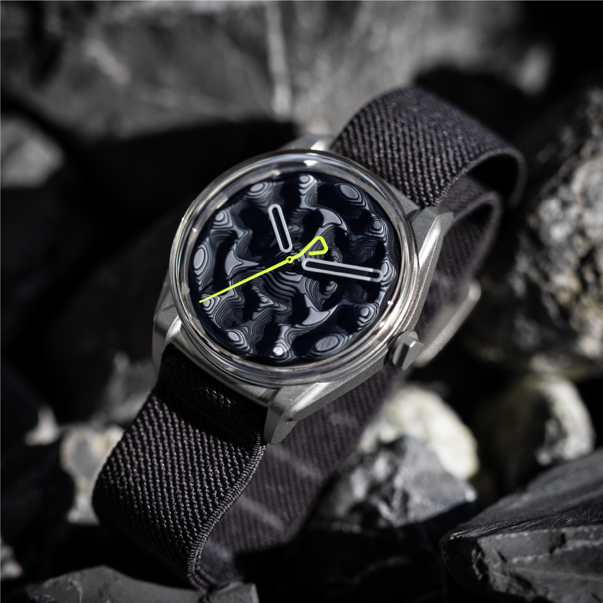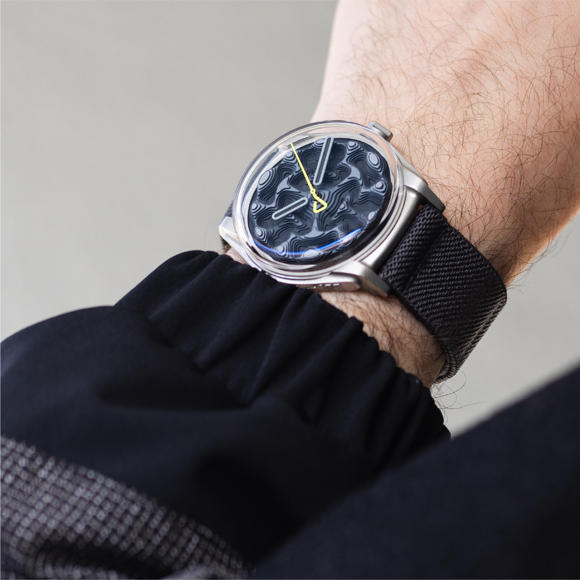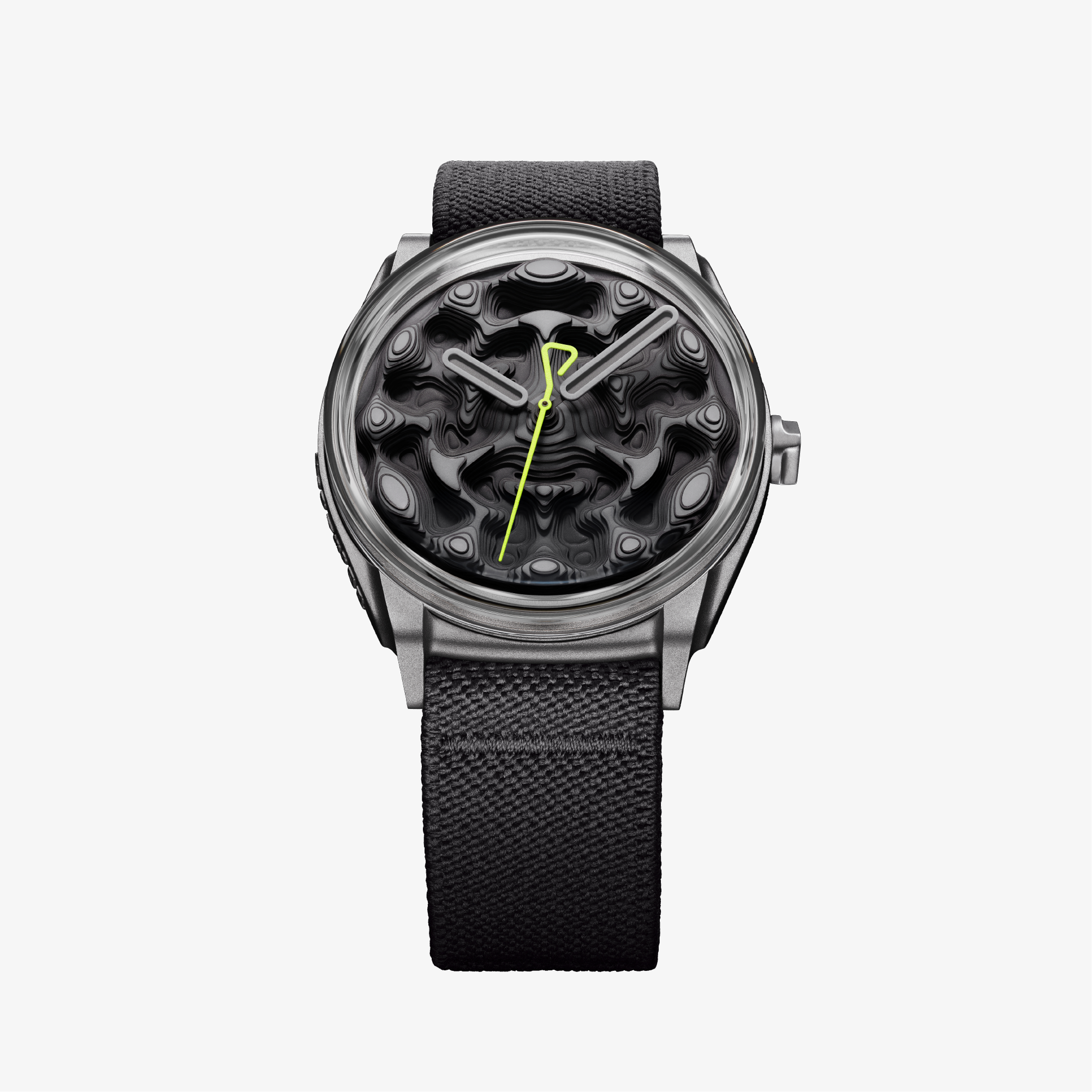 Composed of 67 individual dial plates stacked across nine layers, the dial forms a true three-dimensional landscape. For Variant B, each level is painted in a progressively darker tone, creating a vertical gradient from light grey at the peaks to deep black in the lowest recesses.
