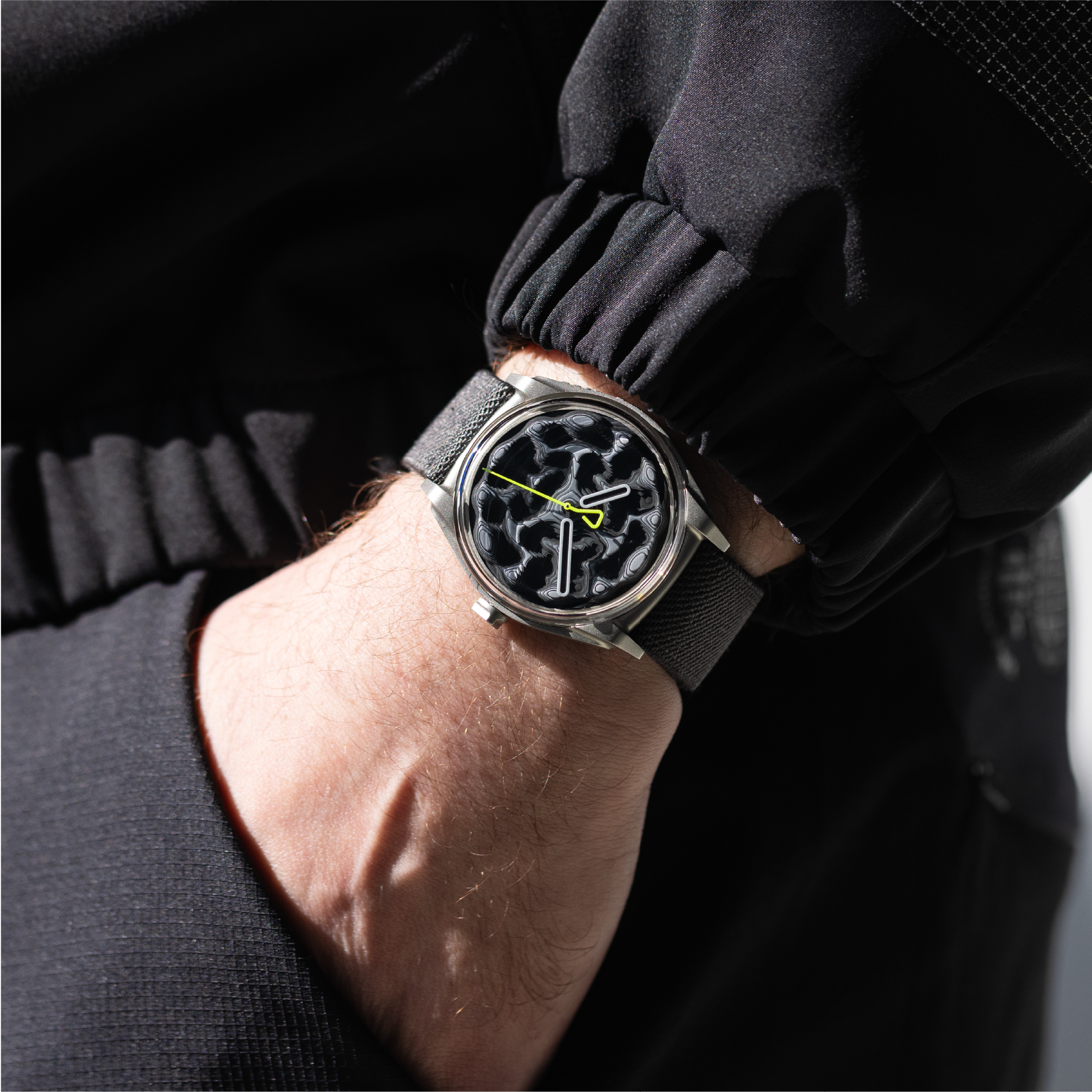 • Fluorescent yellow seconds hand with triangular counterweight