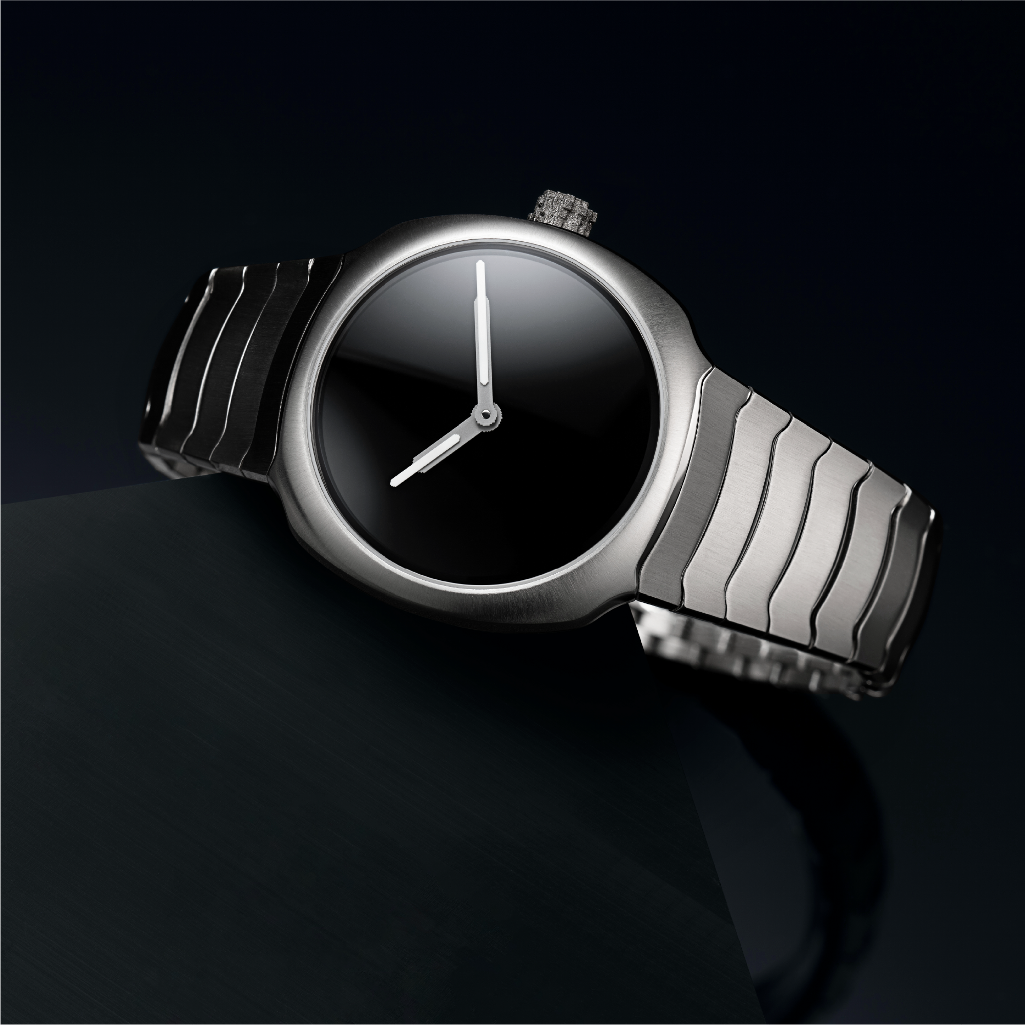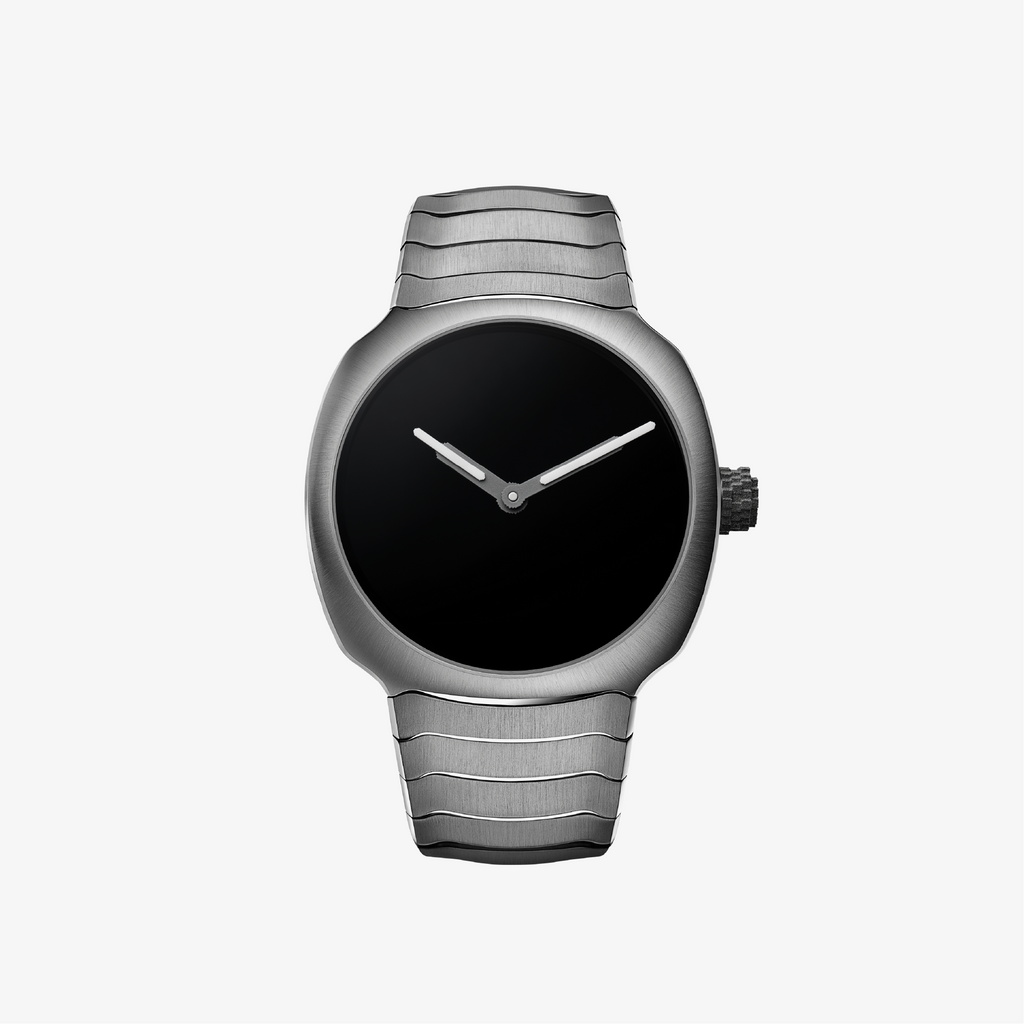 A steel cushion-shaped case, sculpted with Moser’s characteristic restraint. An integrated bracelet that flows with quiet confidence. And a dial in Vantablack®, the darkest substance ever created, absorbing 99.965% of visible light — leaving only the hour and minute hands to cut through the void.