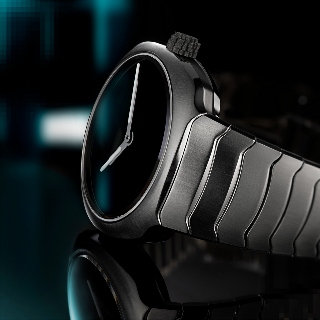 The iconic pixelated elements of the first Genesis return in subtle form: a 3D-printed titanium crown and pixel-style Globolight® inserts on the hands. Digital language translated into physical texture — a reminder of the trilogy’s origin, now rooted in steel instead of the screen.