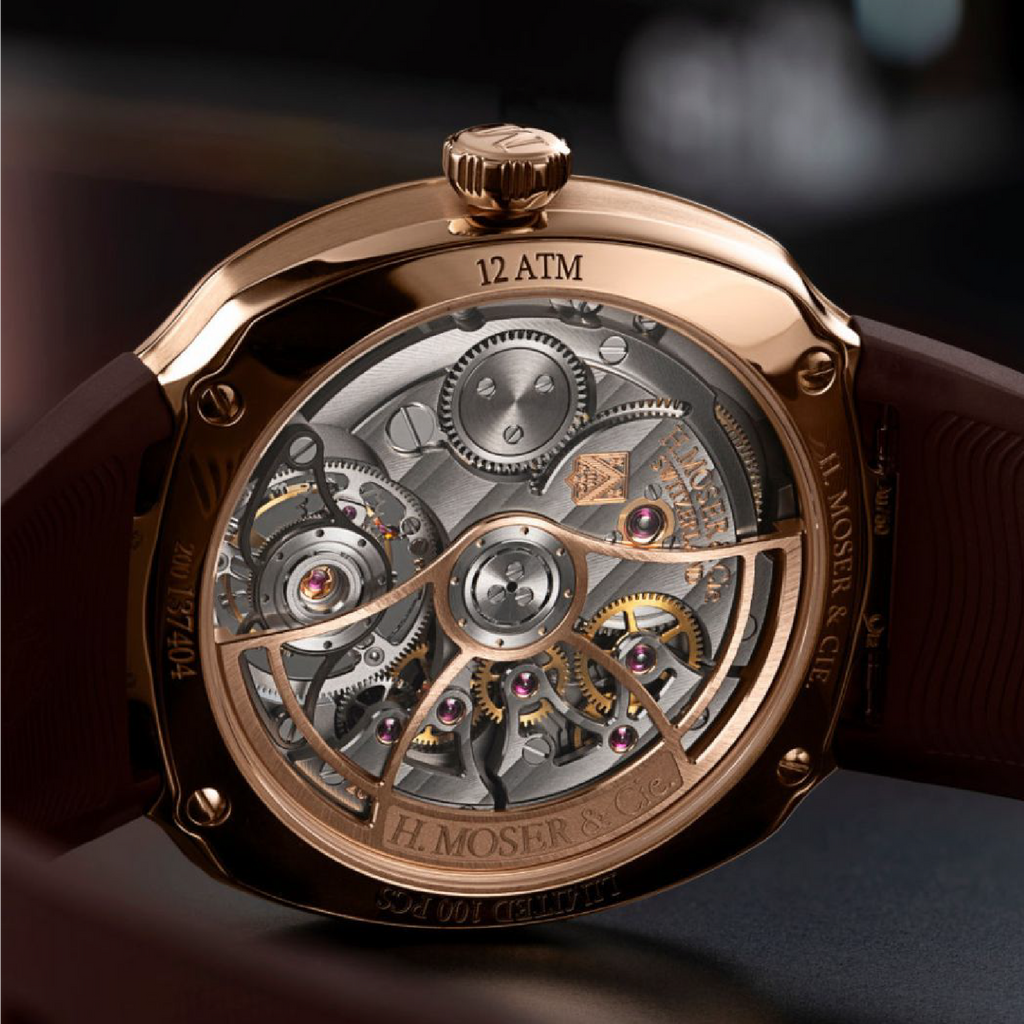 Skeletonised 18-carat red gold rotor with engraved H. Moser & Cie. logo