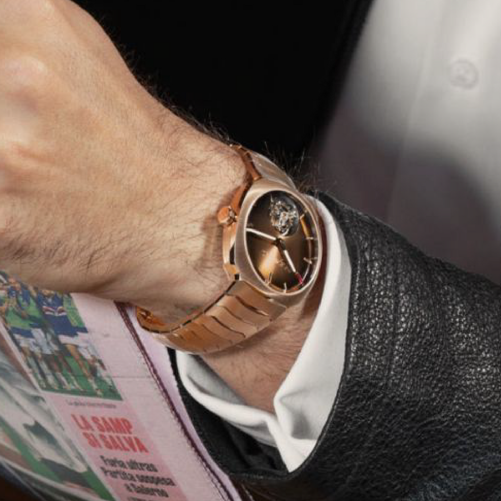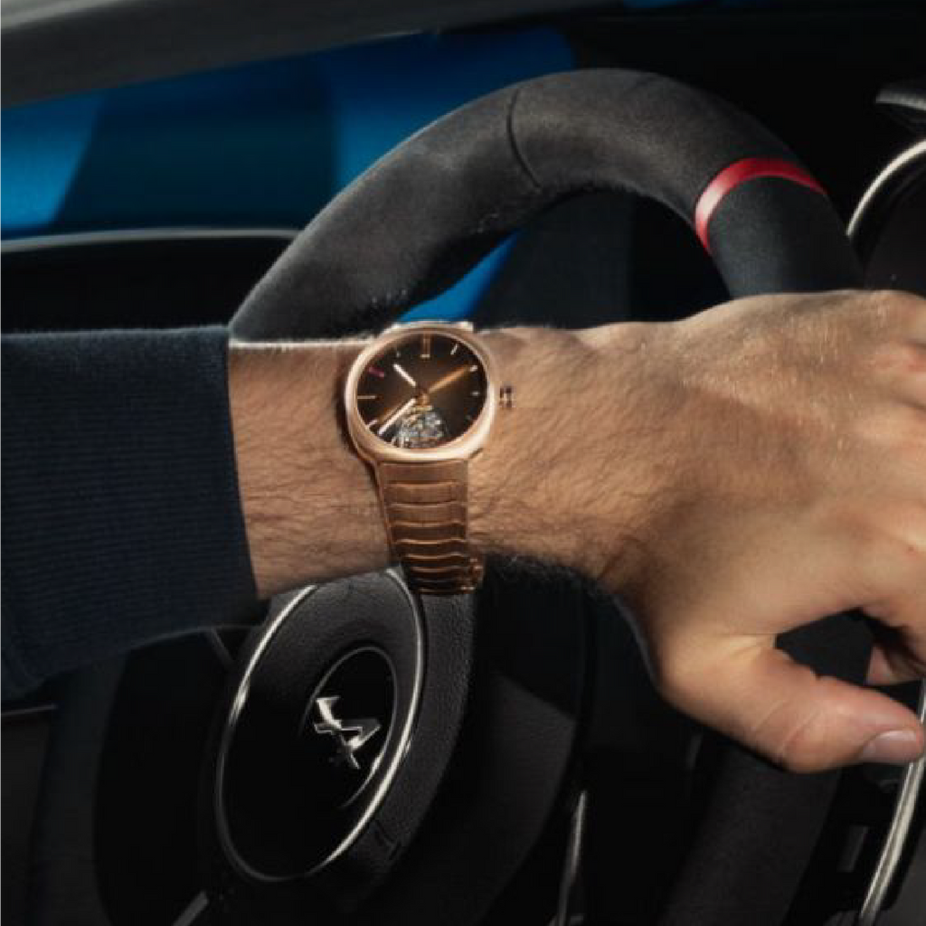 Its fully integrated red gold bracelet flows seamlessly from the case, sculpted with Moser’s signature organic lines for a continuous silhouette that balances sport and elegance. Limited to just 10 pieces worldwide, this is a collector’s piece that blends horological artistry with Gasly’s passion for detail.