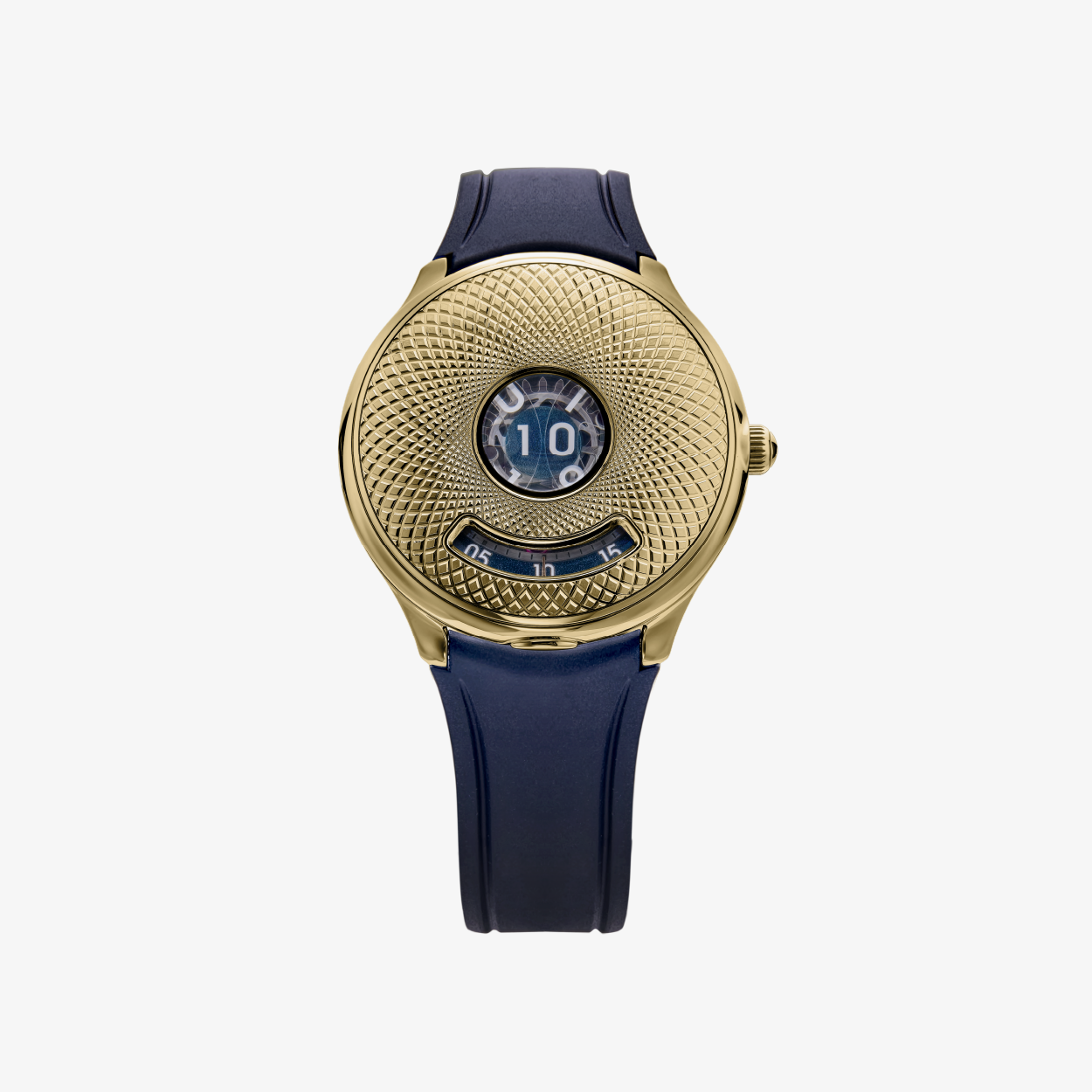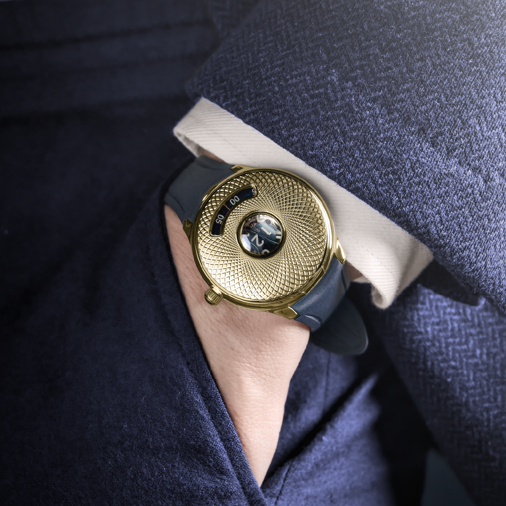 Forged in 3N 18-carat yellow gold and finished with a hand-made three-dimensional guilloché cover, it hides a patent-pending jumping-hour display that reimagines the 19th-century pocket watch for a new century.