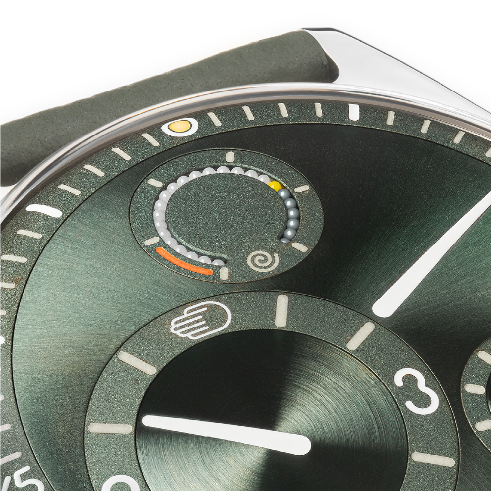 Instead of a typical indicator, you get a trail of ceramic micro-balls. Light and dark. As the watch winds, they shift. It’s subtle, slightly hypnotic, and very… Ressence.