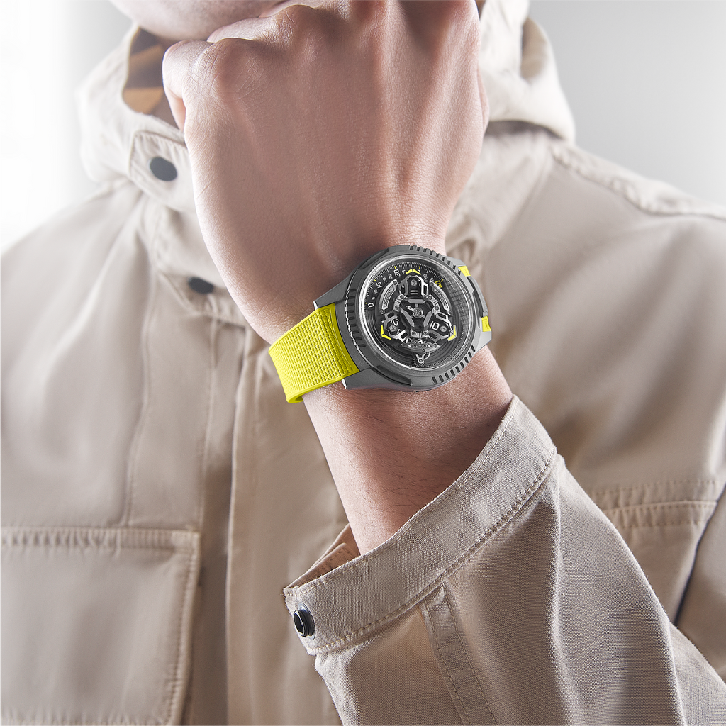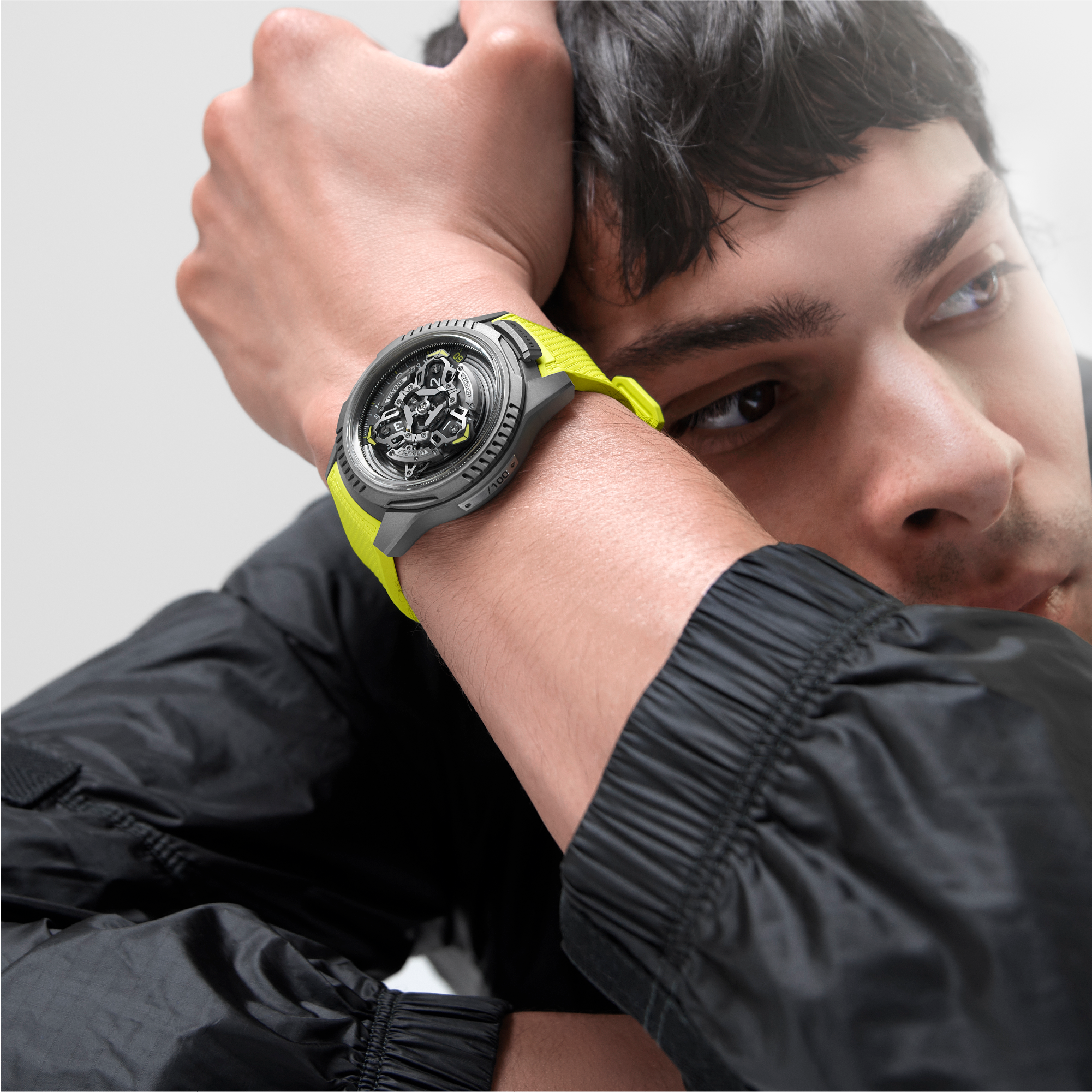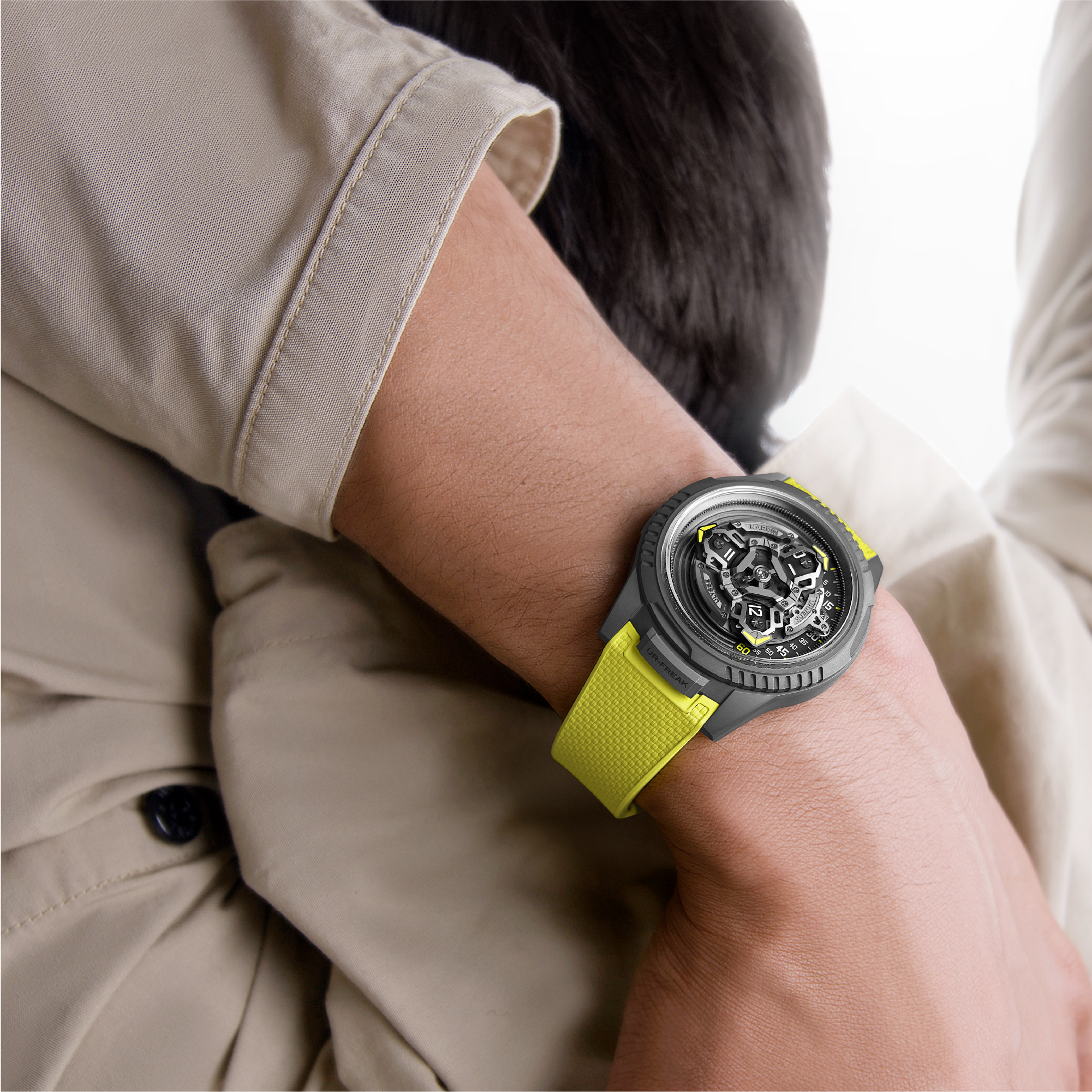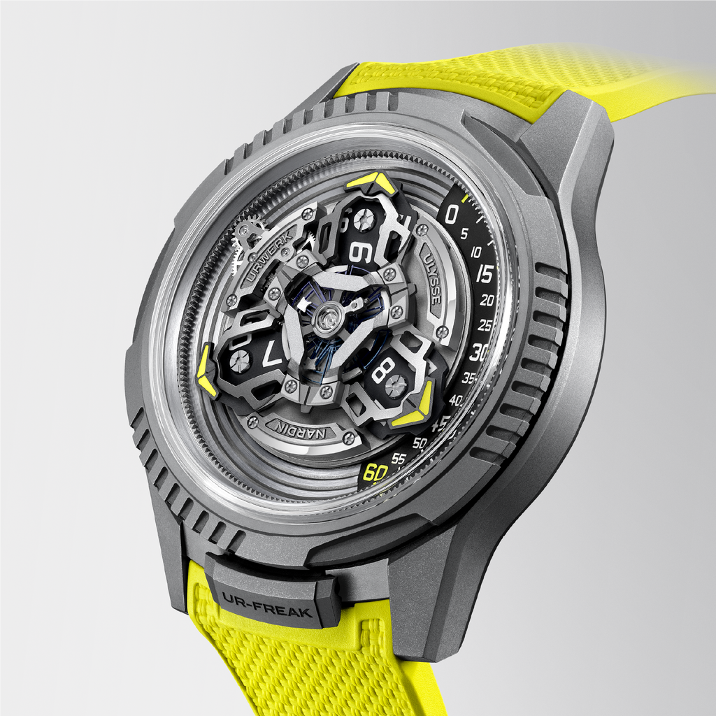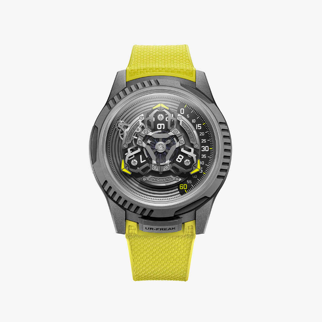 Inside the lightweight sandblasted titanium case, a central oversized silicon oscillator takes center stage, supported by a DIAMonSIL escapement and Ulysse Nardin’s Grinder® automatic system, one of the most efficient winding mechanisms in the industry. The result: a 90-hour reserve and a display that feels alive on the wrist. Finished with a neon yellow rubber strap, the UR-1 is limited to 100 pieces worldwide—a modern mechanical lightning strike.